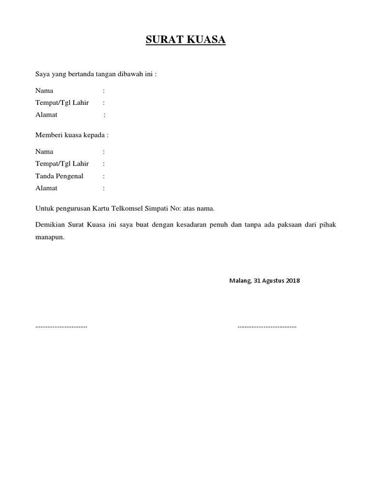 Terutama bagi kamu yang berencana mengurus/menukar/mengganti kartu sim xl lama dengan yang baru, tapi tidak sempat. Contoh dibawah ini bersifat umum dimana anda bisa merubahnya. Bagaimana cara membuat surat kuasa? Check spelling or type a new query. Contoh surat kuasa pengambilan untuk menghadap ke pengadilan negeri pati guna mengurus proses pembagian harta warisan. Salah satu perihal penting tersebut adalah mengurus. Pahami persyaratan membuat surat kuasa berdasarkan contoh surat kuasa di bawah ini. Surat kuasa untuk mengurus atm hilang atau terblokir tujuannya adalah untuk meyakinkan kepada instansi atau bank bahwa anda sedang membutuhkan pertolongan dan nah agar tidak bingung mengenai format surat kuasa urus atm hilang atau terblokir berikut contoh surat kuasa tersebut Mengurus sim hilang juga memiliki beberapa syarat yang harus di penuhi, persyaratannya mengurus sim hilang sendiri tidak jauh berbeda dengan syarat perpanjang sim seperti fotokopi sim, surat keterangan sehat, lulus tes psikologi, dokumen lainnya, namun dengan menyertakan sebuah surat. Biasanya orang membuat surat kuasa, karena. Dengan membaca artikel ini kamu akan bisa membuat surat kuasamu sendiri untuk berbagai keperluan. Selain itu, tujuan adanya surat kuasa ini adalah jika pemiliki asli dari atm tersebut berhalangan hadir dapat diwakilkan oleh orang yang sudah diberikan. Contoh surat kuasa adalah salah satu contoh surat yang berisikan pelimpahan wewenang dari surat berisi pemberian kuasa/wewenang kepada seseorang untuk mengurus sesuatu kepentingan.